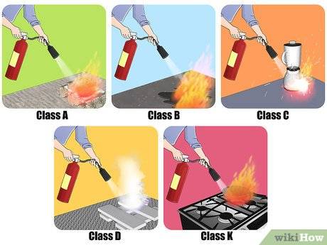 4 检查灭火器类型。灭火器基本上都是按火的种类分为5类。以下分类是欧盟标准,香港及中国大陆亦使用同一分类: A类(Class A):含碳可燃固体之火警,如木、草、纸张、塑胶、橡胶 B类(Class B):可燃液体之火警,如汽油、柴油、油、机油 C类(Class C):可燃气体之火警,如石油气、天然气、乙炔、甲烷 D类(Class D):可燃固体金属之火警,如镁、铜、铁、铝 E类(Class E):通电物体之火警 美国标准与其他国家接近,分为:A、B、C、D、K: A:含碳可燃固体之火警,如木、草、纸张、塑胶、橡胶 B:可燃液体之火警,如汽油、柴油、油、机油 C:通电物体之火警 D:可燃固体金属之火警,如镁 K:厨房发生之火警 灭火器成分可以是水、泡沫、干粉、湿粉、二氧化碳、卤化烷等。 水:常用于A类灭火器。水对燃料表面有极佳降温效果,可减低燃料气化。灭火器的水通常不会大量雾化,因此对燃烧中的气体作用不大。通常水剂灭火器内会加入少量其他化学品,以避免灭火器生锈。部份灭火器亦加入少量化学物减少水的表面张力,让水能更容易渗入燃烧中物体内部。水不一定能救灭液体(B类)火灾,视乎液体燃烧的份子的极性。水可以救灭极性燃料(如酒精)的火,但用在非极性燃料(如燃油)上,却会把火散开,令其更为不受控。把水射到电火上,可能会令施用者被电击。除非电力肯定已被切断,或者使用特别喷嘴,令水成为非连续之水珠,否则不应用水在电火之上。 泡沫:常用于B类灭火器,亦可扑灭A类火患。常泡沫灭火剂是水加入泡沫剂,令泡沫能浮在燃烧中的液体之上,隔绝火及燃烧表面。普通泡沫可用在非极化燃料如汽油之上,但用在极化液体如酒精或甘油则可能会过快分解而失效。储存大量极化易燃液体的地方要使用特别之酒精泡沬。 干粉:B类或电火(即E类,或美国之C类)可使用干粉灭火剂。干粉灭火剂主要为两类: BC粉是碳酸氢钠或碳酸氢钾粉末,以二氧化碳或氮气推动。粉末能吸收火的热力,令燃烧的化学反应无法继续。部分粉末亦可稍为抑制化学反应进行。粉末可令火势暂停漫延,但未必足以压灭火。因此通常会与泡沫一同使用。 ABC粉是硫化氨或磷化氨。除了能压制火外,更会溶解成一层黏膜,阻隔燃烧表面与气体的热力传送。因此对A类火亦有效。ABC 粉是对付多种火最佳的选择。但对付立体的A类火,则以水或泡沫较为有效。 这两类粉剂皆可用在电火之上。但其腐蚀性很可能令设备无法修复。 湿粉:以乙酸钾或柠檬酸钾及碳酸氢钾造成,可用在厨房火灾(K类)上。粉末除了降温外,亦能皂化,在煮食油上形成一层泡沫。但皂化只会在动物油脂上发生,因此不能用在B类火上。 二氧化碳:二氧化碳(CO2)可用在B类,C及E 类火上。作用是把空气排挤,令火失去氧气熄灭。因为二氧化碳是气体不会残留,因此用于电火可避免损坏设备。(二氧化碳用在A类火上是可行的,但必须长时间使用,手提灭火器不可能提供足够的剂量。)二氧化碳灭火器的喷喉顶部通常为一筒状。由于二氧化碳储存在灭火器时是十分低温,使用时要小心避免接触,以免引起冻伤。因使用二氧化碳灭火时,会减少火场及燃烧物品的氧气量,所以在空气不流通的环境下使用二氧化碳灭火,会影响呼吸,不适合长时间使用,使用后必须尽快离开现场。 卤化烷:多功能灭火剂,能救灭D类以外的火,而且只需颇低的份量(不足5%)即可。卤代烷用在A类火亦可,但其效果不佳,9磅(4公斤)的卤代烷灭火器只等于1/4加仑水,而且易为风所影响。卤代烷是少数在飞机内亦可安全施放的灭火剂,不会对‘飞机’构成腐蚀;飞机上常用Halon 1211。在密封的情况下,卤化烷有微毒;非常温压下,甚至可能水解出“光气”(参见海龙)。卤化烷能改变火的热力分布,同时抑制火的化学反应。由于卤化烷属氯氟化碳,会对臭氧层造成破坏,因此正逐渐被取代。1992年起加拿大已禁止使用及贩卖卤化烷灭火器。2003年以后欧洲及英国亦禁止在飞机以外使用卤化烷。在中国,据国家环境保护总局规范,卤化烷被禁止用作灭火剂。 氟化碳合物:美国杜邦化工开始生产以接近饱和之氟化碳合物作灭火剂,替代卤化烷。这些灭火剂据称毒性较卤化烷低,不会损害臭氧层,但使用时浓度要比卤化烷高一半。 D类火:D类火由燃烧中的金属产生。这类火制造大量高热及极具反应性。例如燃烧中的镁会把水分解,产生的氢气可引起爆炸;卤化烷亦会被分解成有毒之光气,同样可能产生爆炸。就算是以氮气或二氧化碳包围燃烧中的金属,仍然可能继续闷烧,并能把二氧化碳变成有毒之一氧化碳。因此对D类火并没有单一灭火剂可用,而必须按所储物料预备不同灭火剂。而使用时亦必须经过特别训练。部份用在D类火的灭火剂如下: 氯化钠及石墨粉末,以铲施放。适用于钠、钾、镁、钛、铝等多数金属火。 石墨粉末以长柄铲施放,用于金属粉末起火。灭火器的气体可能把金属粉吹起,引起尘爆。石墨能隔绝空气及带走热力。 以氩气推动铜粉灭锂火。氩能隔绝空气及铜能带走热力,并黏附在溶解之锂金属上。 在没有以上物料时,必要时以长柄铲把干沙堆在金属火上。但沙中的极少水份都有可能引起蒸气爆炸,把金属射到四周。 细水雾:细水雾是海龙灭火器的替代品,可以扑灭液体火。其主要机理是吸热、置换氧气和隔绝辐射。 你必须根据火灾类型迅速决定你的灭火器是否适用于灭火。通常ABC干粉型灭火器适合用于扑